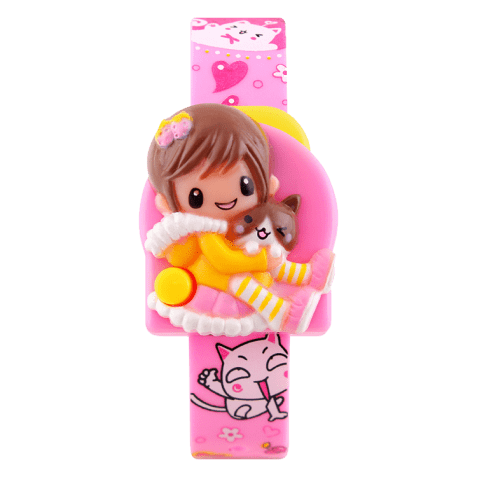 This is an absolutely unique watch, I’ve never seen anything like it!!! It looks so cool and cute, I wish we had such watches when I was a kid lol. I got it for my 6 yr old and she adores it!!! The little girl and the cat are very nicely designed, the band is smooth and comfy. Amazing gift for little girls!!!
