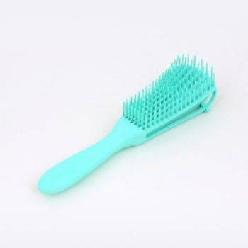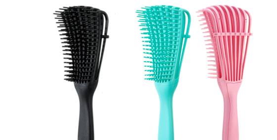 I love these detangling combs. They make the process much easier because the flexible rows of bristles apply tension but loosen if it gets caught. The typical brush only loosens bristle by bristle. You can adjust how much tension by only using the end of the brush or more tension if you brush close to the handle These rows of bristles can also be locked in they the included brace. There are two “settings” to place the brace so you can choose how you want for the amount of curl in the hair. The brush material is a flexible plastic and non-porous, not silicone or rubber. So it can be disinfected through immersion. Overall, this is a good comb for personal or professional use on not just curls, but all hair types to avoid developing traction issues with combing wet hair.