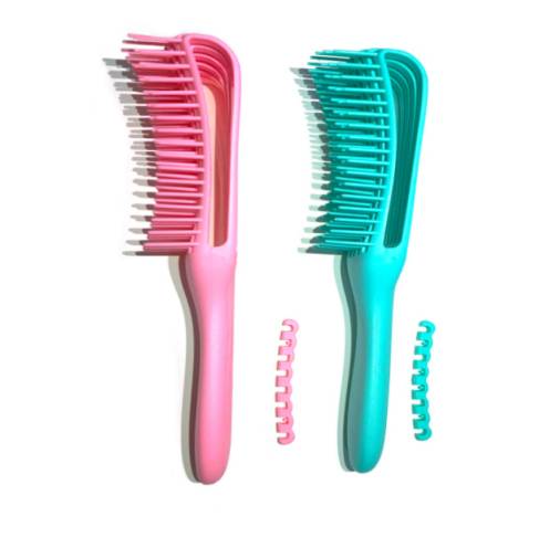 My daughter and I have SUPER curly hair. She’s 10 and learning to take care of it herself. She often doesn’t get conditioner worked all the way through, resulting in a tangled mess. I ordered this 2 pack so she’d have one brush in the shower (to brush the conditioner through) and one for when she got out so I could make sure she got all the tangles out. We used it last night and it worked PERFECT! I love he fact that it’s plastic so I can clean it easily and that it’s curved. Highly recommend!!!