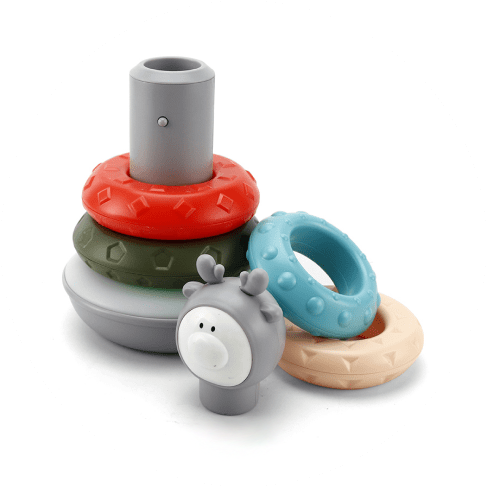 This stacking toy has a button on the pole, and when the child puts a ring on it, it makes a fun sound and changes the color. Combined with uneven texture, it’s an excitement multiplied by 3!
