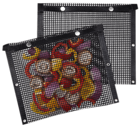 Mesh bags are very sturdy and easy to snap close. Wonderful to be able to turn all vegetables over at one time. When done just rinse in hot water and reuse. Great time-saving item!
