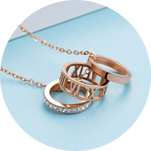 The rose gold-colored necklace is made of stainless steel. It is composed of three non-identical rings. Type of chain: cable. Length: 18 in + 2 in.
